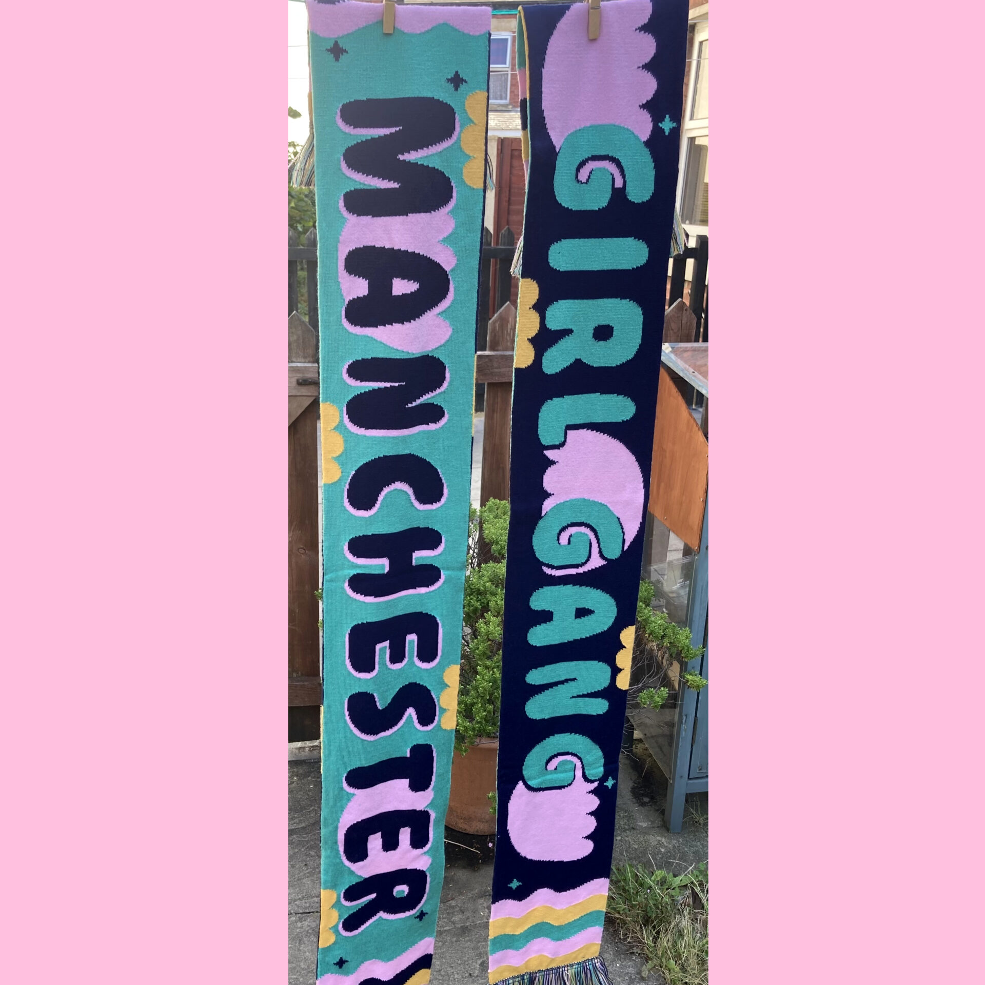 Cosy, colourful scarf featuring Girl Gang on one side and Manchester on the other.
